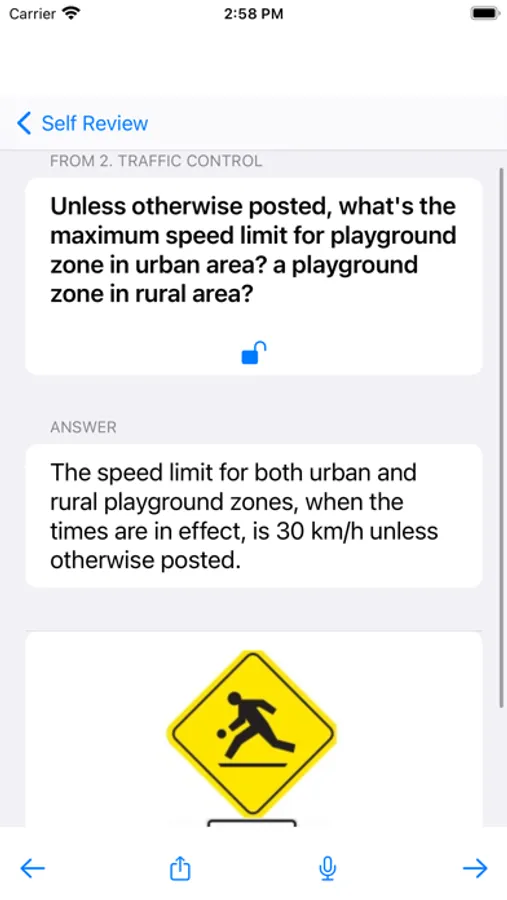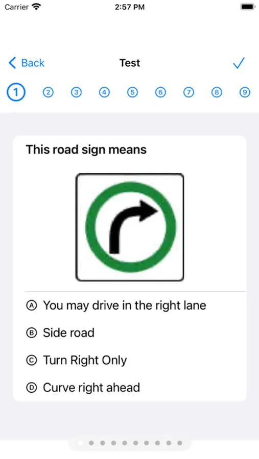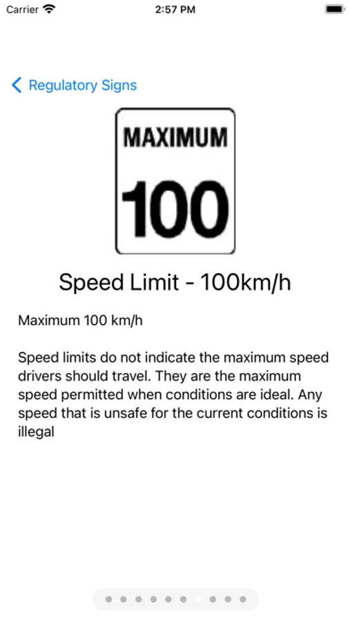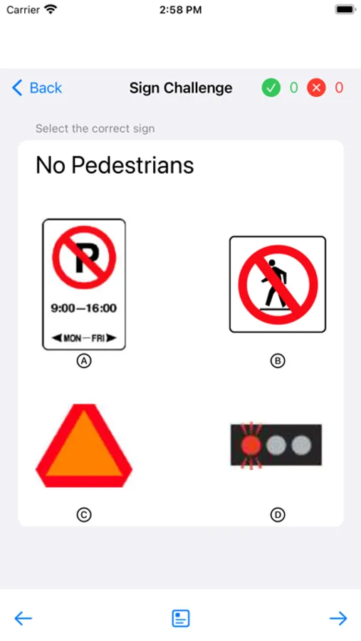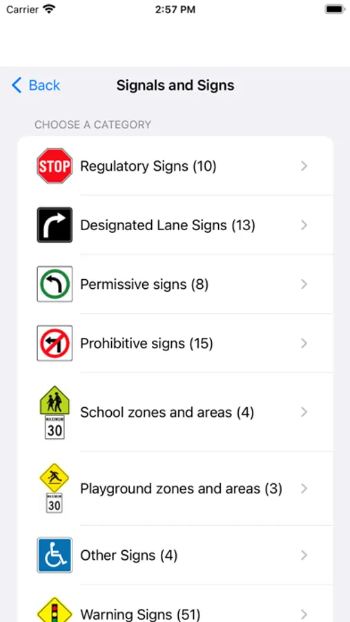 Road signs are assigned into different groups, e.g. warning signs, regulatory signs. And they can be shown in a list or flashcard mode. Also, there are many sign questions for you to practice.