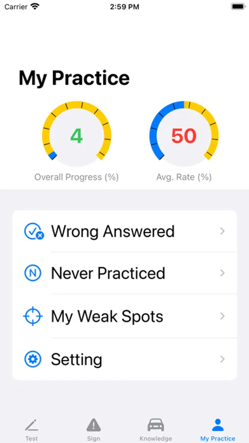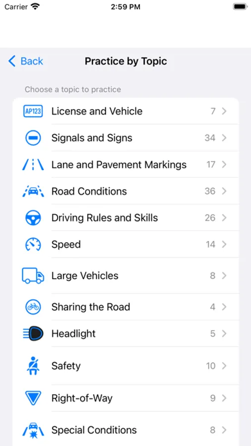 Knowledge questions are assigned to various topics based on Driver's Manual. You can choose to practice on certain topics.