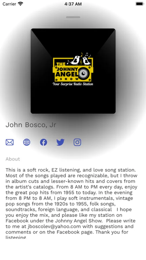 This is a soft rock, EZ listening, and love song station. Most of the songs played are recognizable, but I throw in album cuts, lesser-known hits, and covers from artist catalogs. Every day between 8 AM to PM, enjoy the great pop hits from 1955 to today. In the evening from 8 PM to 8 AM, I play soft instrumentals, vintage pop songs from the 1920s to 1955, light classical, folk, soundtracks, and cross-over classical artists. I hope you enjoy the mix, and please like my station on Facebook under the Johnny Angel Show. Please write to me at jboscolev@yahoo.com with suggestions and comments.