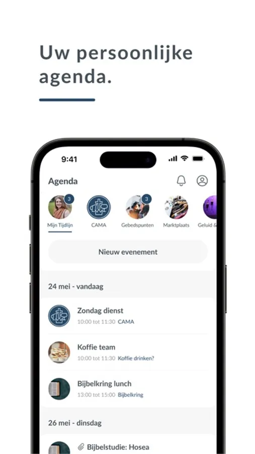 View the calendar for your entire community, but also for specific groups. Thanks to the smart group structure, each user has his own unique church calendar. Then link it to your own personal calendar and don't miss a thing!