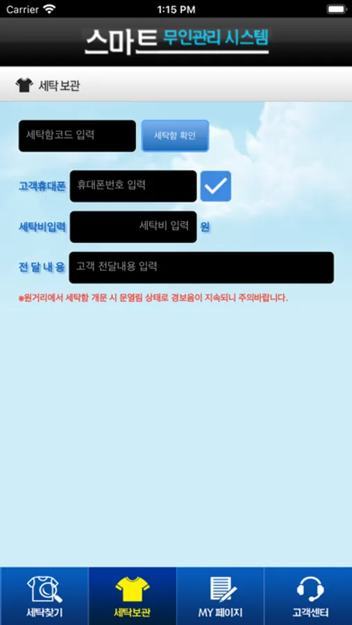 이제 언제 어디서나 편리하게 스마트폰을 통해 실시간으로 세탁함 정보를 제공받아 원하는 세탁함에서 물품을 보관하고, 찾을 수 있습니다.