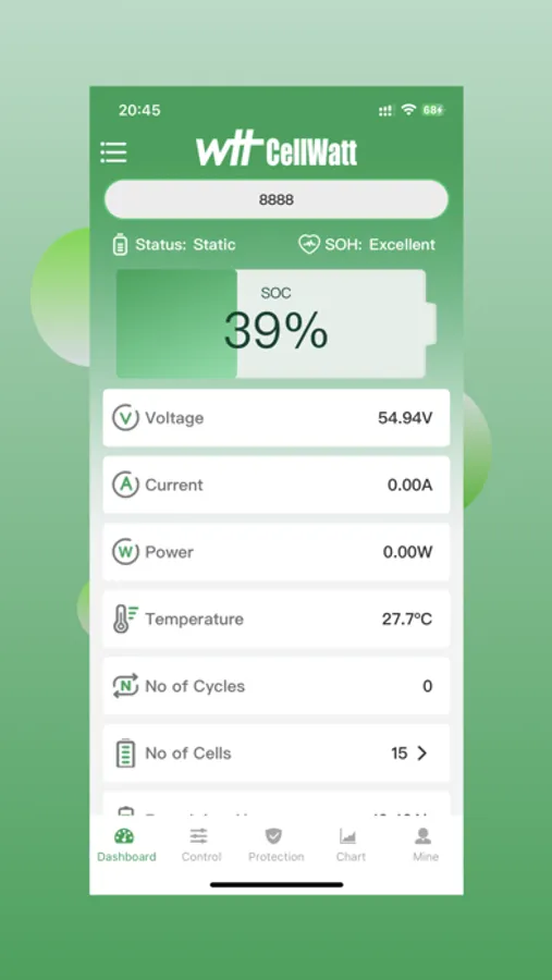 2) Displays detailed battery information on the "Dashboard" tab including : State of Charge, Voltage, Current, Power, Temperature, No of Cycles, No of Cells and Cell Voltage, Remaining Ah.