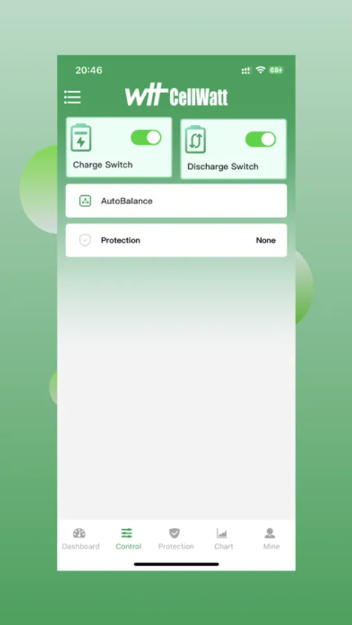 3) Provides interactive functions on the "Control" tab including: Charge Switch, Discharge Switch, Protection and AutoBalance.