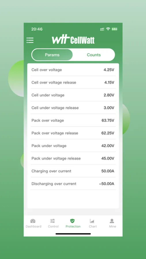 4) The "Protection" tab include the protect voltage, protect current parameters and protection count of battery device.