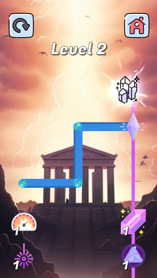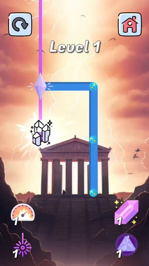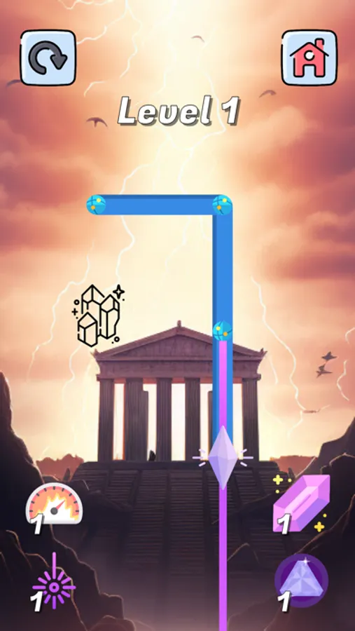 In Zeus Wanderer, your mission is to manipulate the main crystal, both in movement and rotation, to connect with and transfer energy to the empty crystals. When the energy laser emitted by the main crystal makes contact with an empty crystal, it begins to fill with the pulsating power. Your ultimate goal is to strategically navigate the main crystal to fill all the empty crystals with energy to advance to the next level.