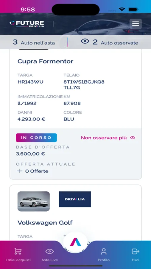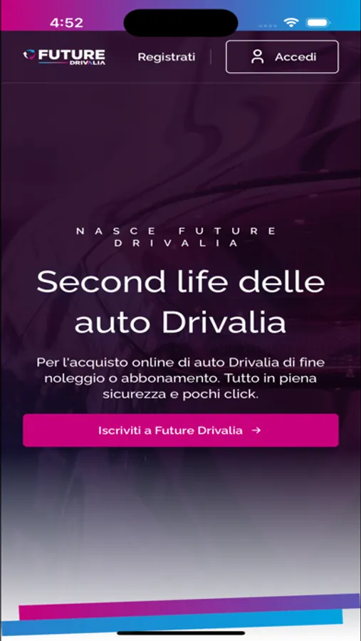 Grazie all’app Future puoi trovare, tra le auto di Drivalia, quella che ti occorre, puoi acquistarla in asta o prenotarla; scegliere tra veicoli di vari brand automobilistici provenienti dalle diverse tipologie di noleggio. DRIVALIA è una società che offre servizi di mobilità attraverso soluzioni innovative e tariffe competitive: noleggio a breve, medio e lungo termine, abbonamenti e car sharing, rivolti sia a privati che ad aziende di ogni dimensione.