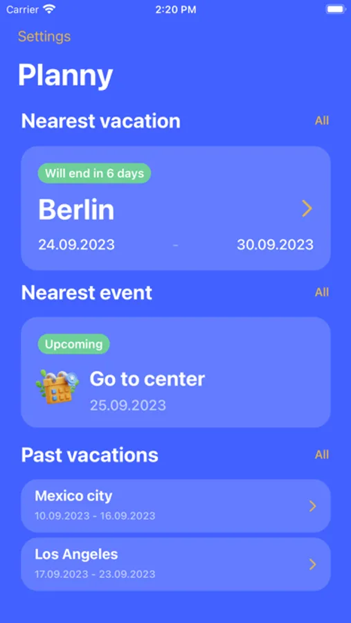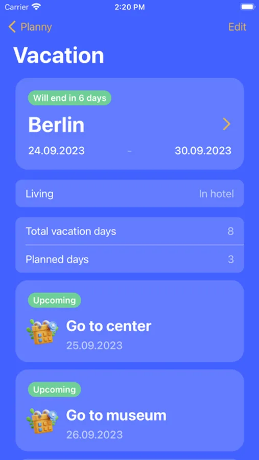 Do you like to plan your entire vacation down to the smallest detail in advance? Planny was created so that you can do this even more efficiently and better! Thanks to Planny, you can now plan your vacation in as much detail as possible so that you can spend it exactly as you intended!Forgetting your vacation plans? Save them in Planny and now you can always check your vacation schedule right on your phone! Restaurant addresses, beach locations, information about opening hours of attractions or places of interest. Now it's all stored in one place and available right in your hands! You no longer need to waste time recording certain data in different places! With Planny you can store a lot of information about your vacation plans right in the app!To get started, add your vacation by date, and start writing down certain planned events for each day of your vacation. Planny will let you know how many days you have left so you don't accidentally go beyond your vacation. Rest better and more consciously with Planny!