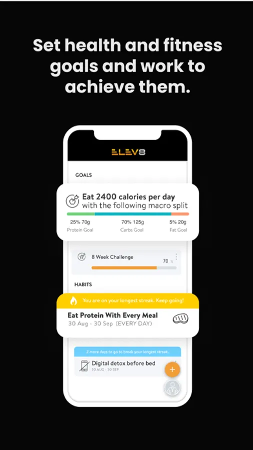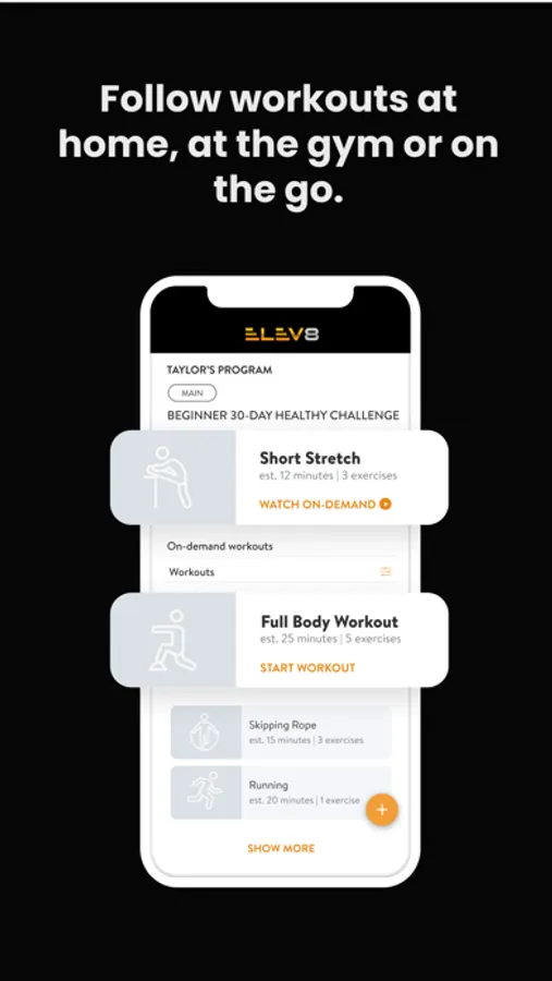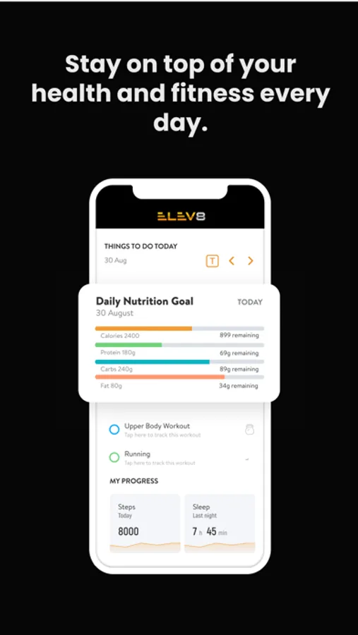 With the ELEV8 App, you can start tracking your workouts and meals, measuring results, and achieving your fitness goals, all with the help of your personal trainer.