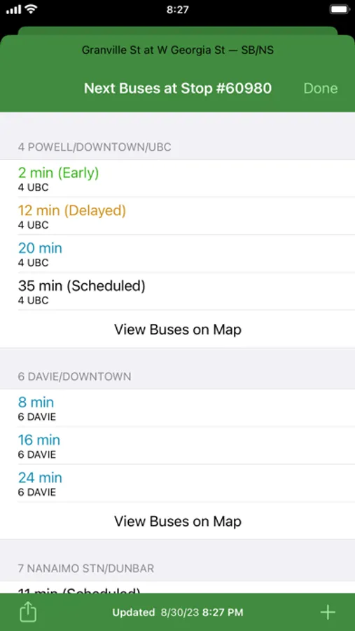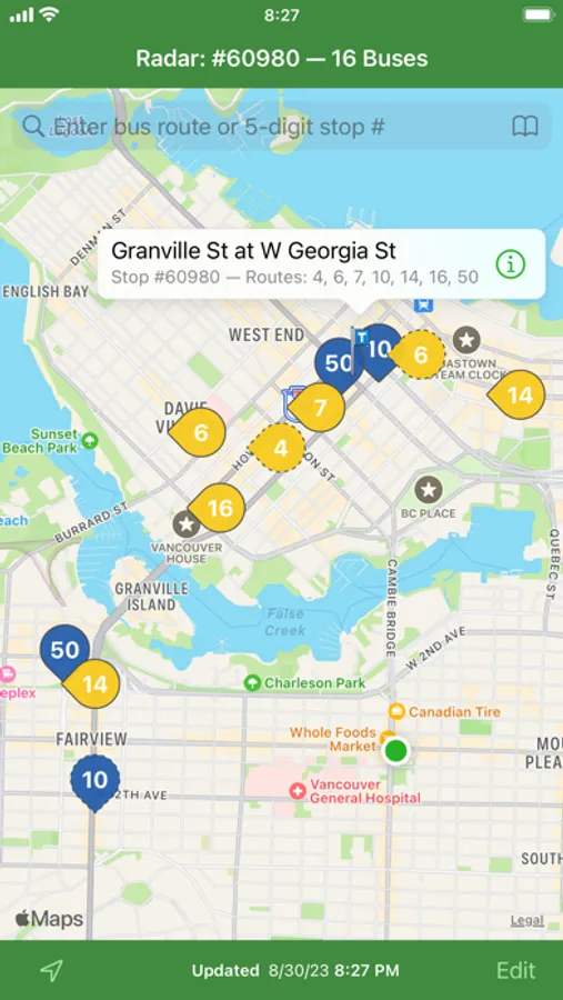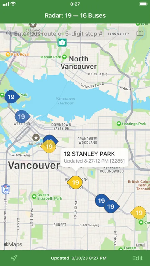 Radar for Metro Vancouver Buses shows you live, up-to-the-minute bus locations in the Metro Vancouver public transit system. It also gives you quick access to estimated next bus times and nearby bus stops.