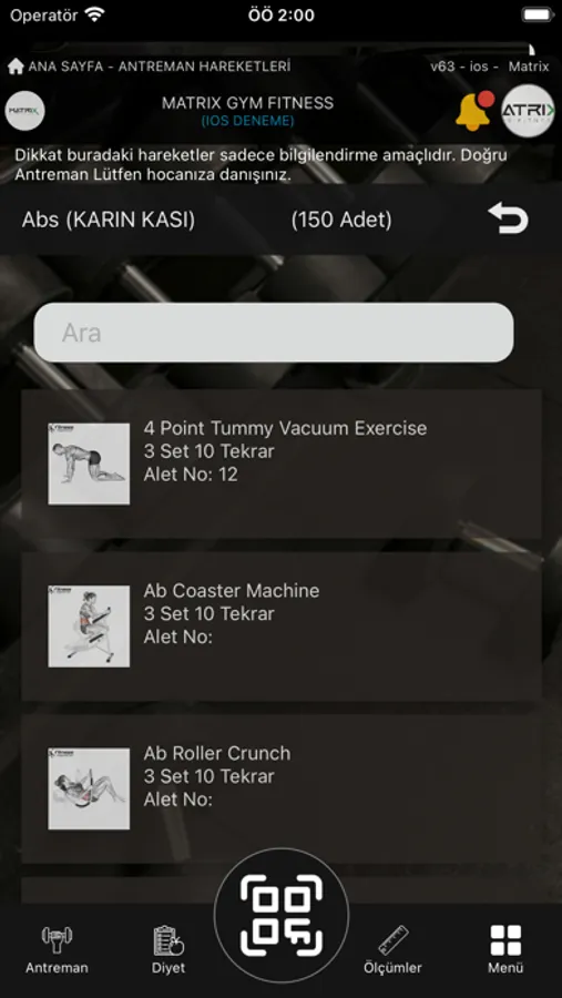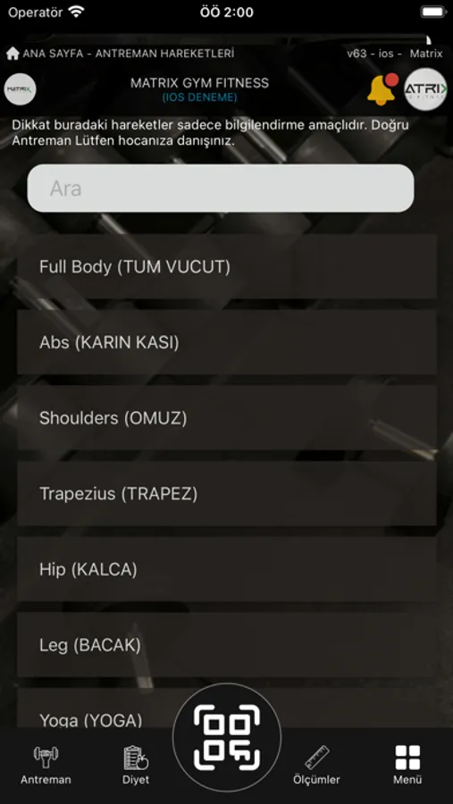 Antrenmanlar: Bu bölümde, spor kulübünde yapacağınız 1500'den fazla egzersizi görsel olarak inceleyebilir, özel antrenman programınızı ve günlük bölgesel gelişiminizi "Matrix" ile takip edebilirsiniz.