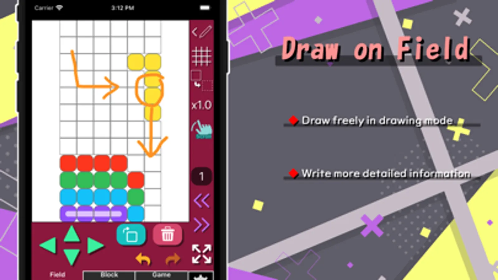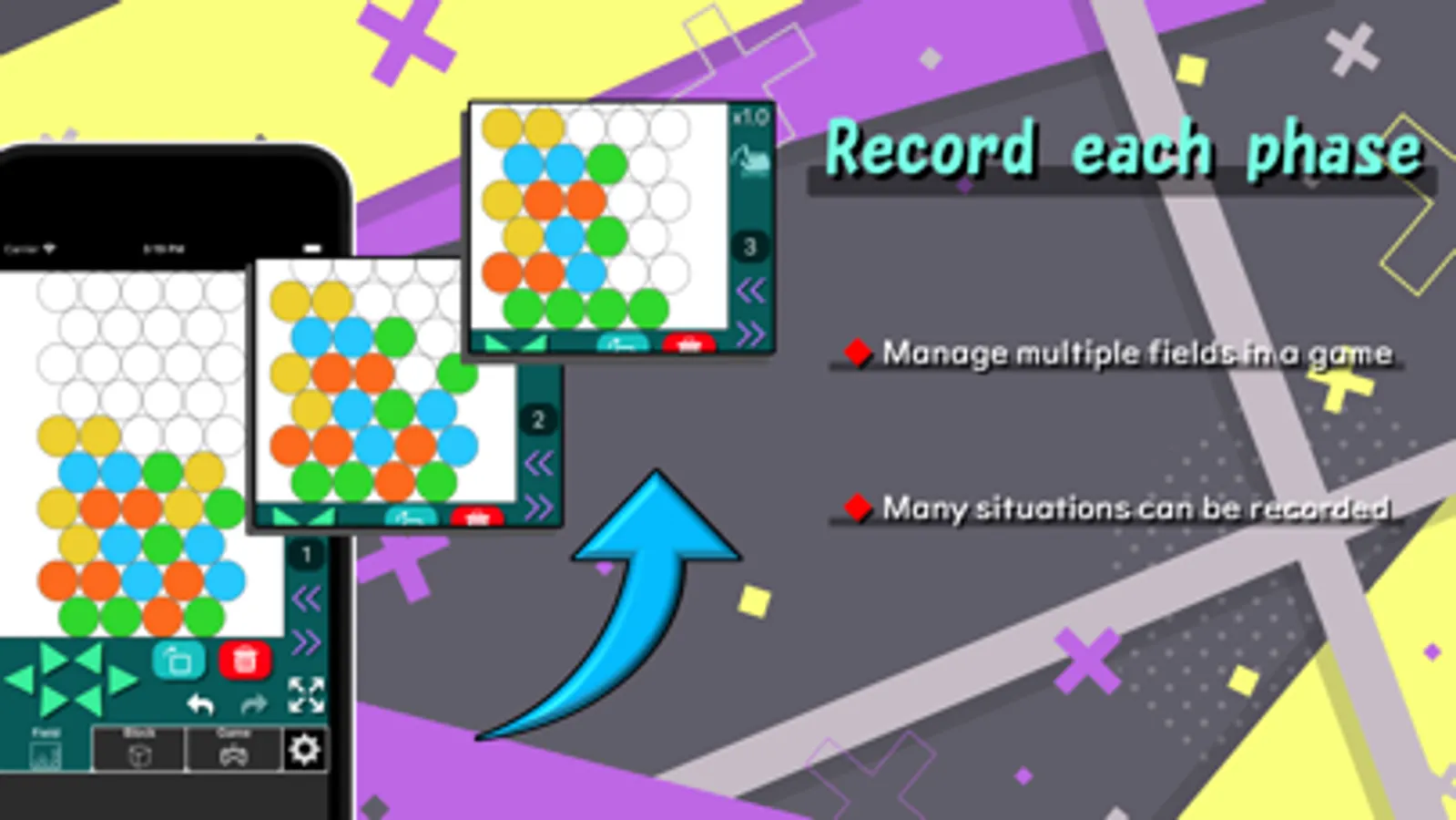 - In the "Field" tab, record detailed game progress by placing blocks, taking memos, and drawing.