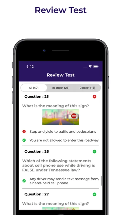 The app includes a Mock Test with random questions and a Practice Test with a variety of Tennessee DMV Permit Test practice questions. These questions are based on the Tennessee Department of Safety handbook.