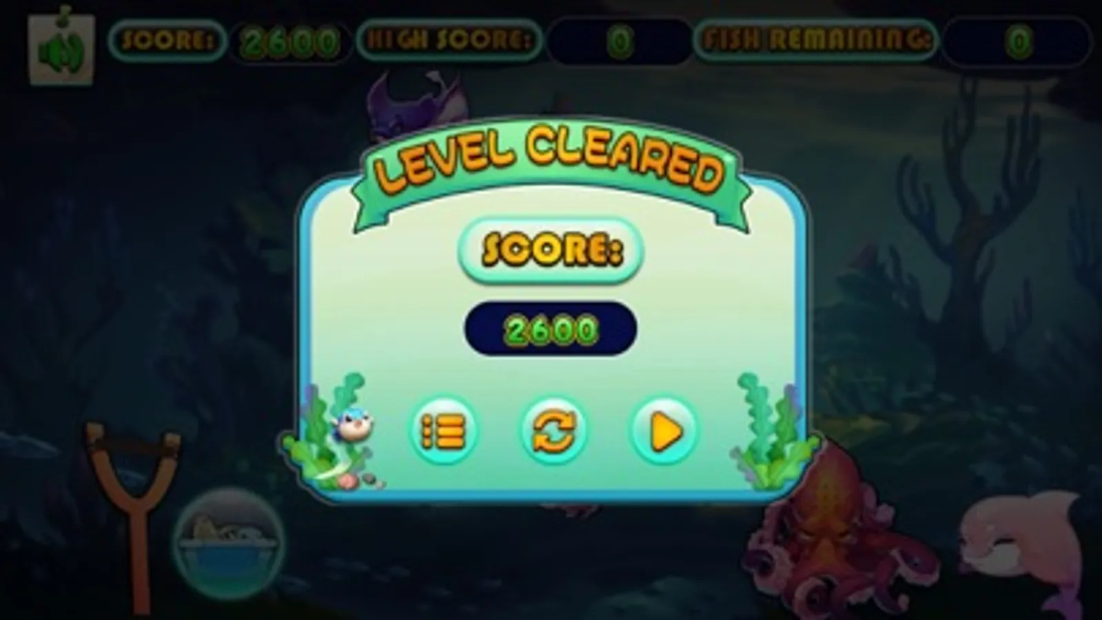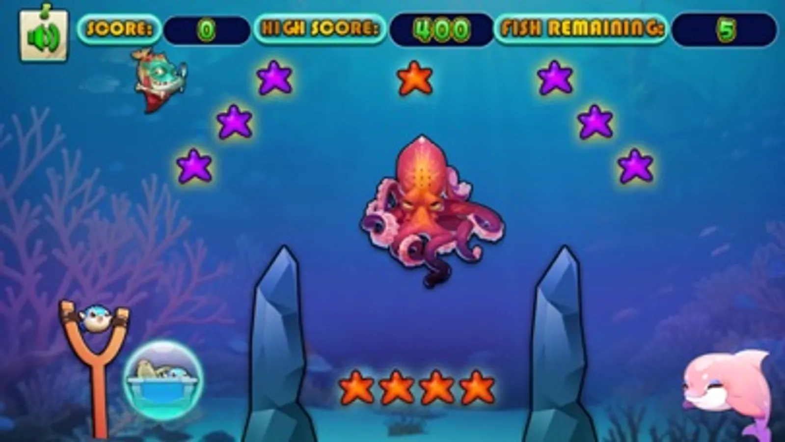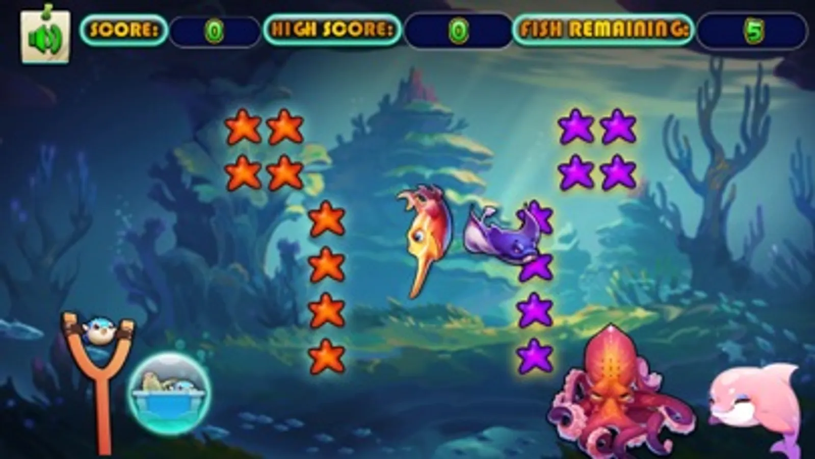 Press the slingshot to adjust the direction of the launch of small fish, and strive to throw more fish into the mouth of the dolphin, challenge high scores, at least let the dolphin eat a fish to pass