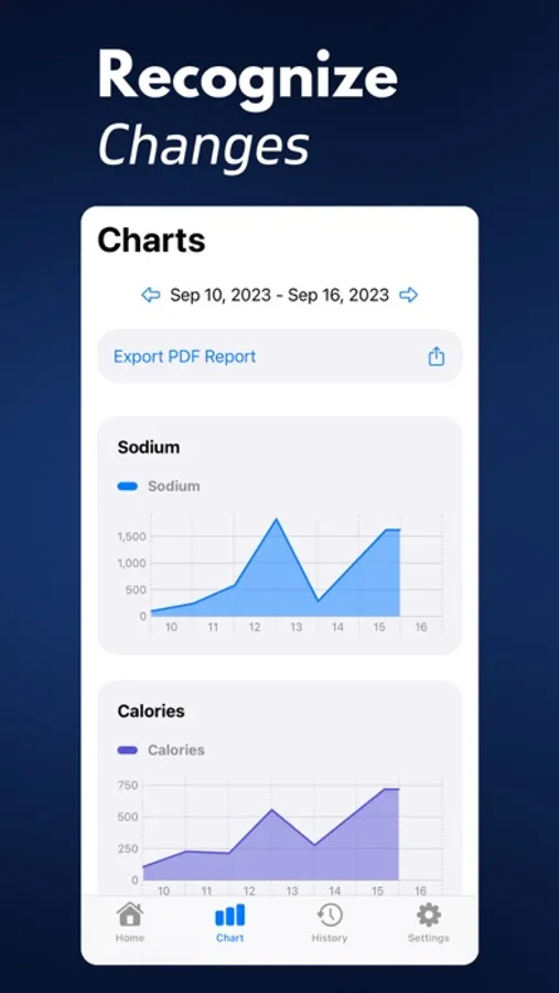 4. Progress Analysis: Gain valuable insights into your sodium consumption patterns over time. Visualize your daily, weekly, and monthly sodium intake through interactive charts and graphs.