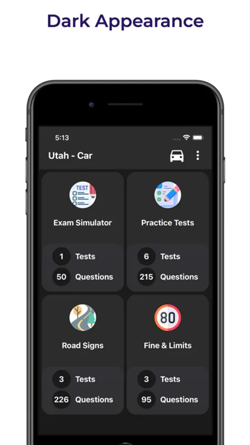 The app includes a Mock Test with random questions and a Practice Test with a variety of DMV Permit Test practice questions. These questions are based on the Utah Department of Motor Vehicles handbook.