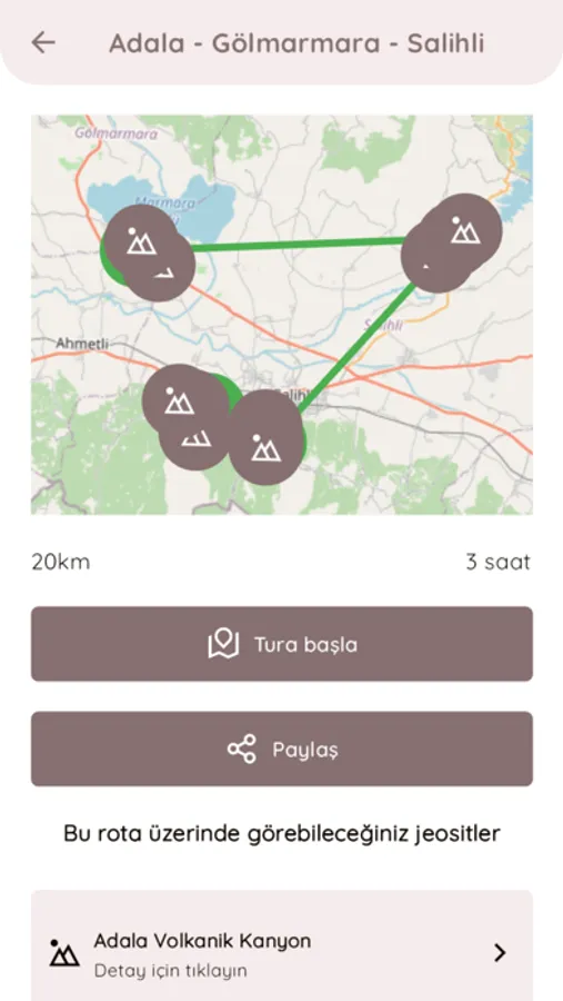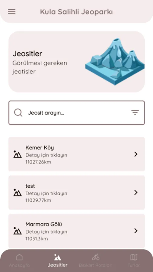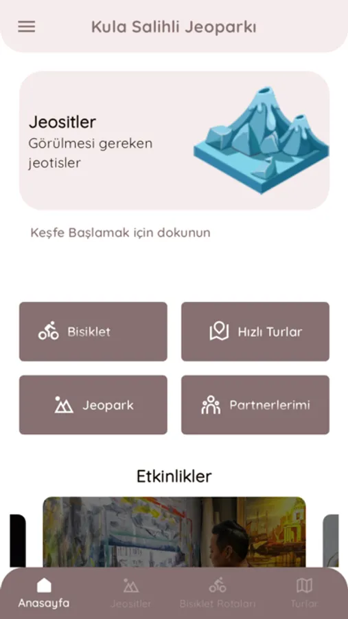 The application contains information about the Kula Salihli UNESCO Global Geopark and the geosites it contains, content such as bicycle routes and sightseeing tours, and the activities and partners of the Geopark.