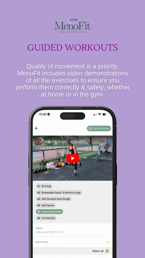 Quality of movement is a priority. MenoMojo includes video demonstrations of exercises to ensure you perform them correctly & safely, whether at home or in the gym.