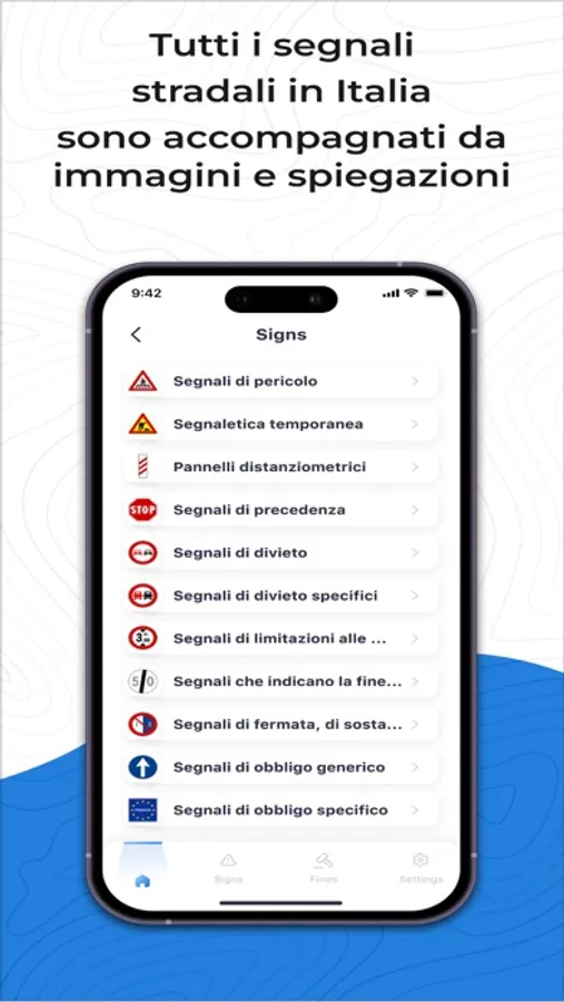 - Ampia copertura del codice della strada italiano e della segnaletica stradale.