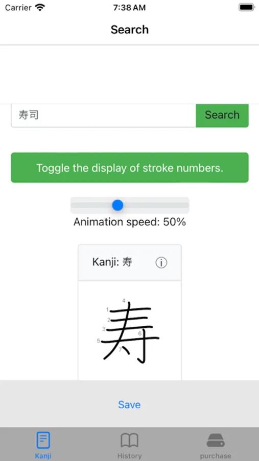 Stroke Order Animations: Learn the correct way to write each Kanji with our intuitive stroke order animations. Adjust the speed to suit your learning pace.