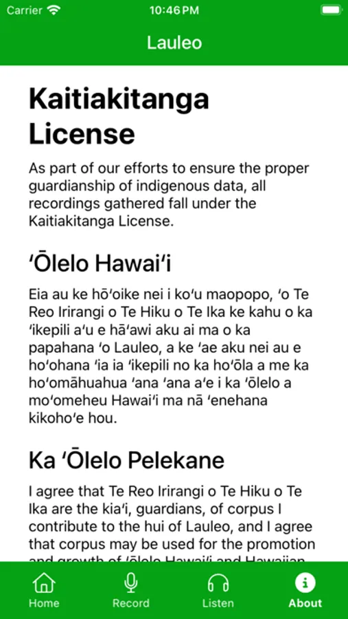 Join the community by sharing your voice to help create a sovereign, digital feature for `ōlelo Hawai`i. Many "AI" tools created today are trained on the English language and Western cultures and values that don't represent the people of Hawai`i. Lauleo is about coming together to help build a body of `ike that will empower Hawaiian communities to build the technologies they need to realize this vision for the future of Hawai`i.