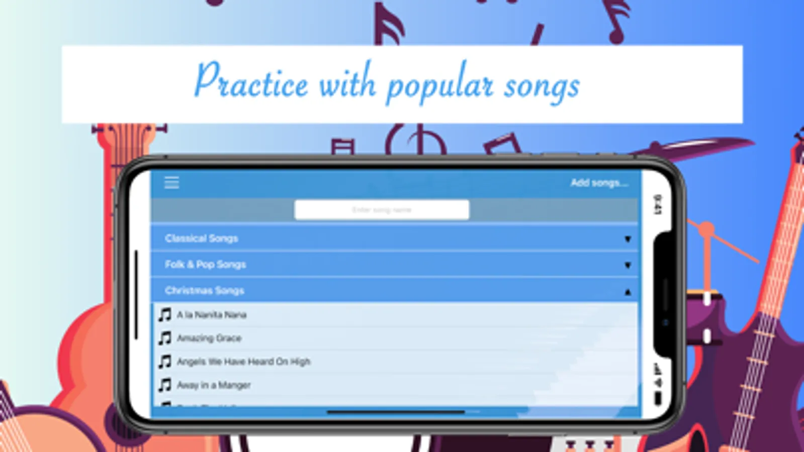 - Two practice modes: practice note by note separately, or practice playing the song at the correct tempo.