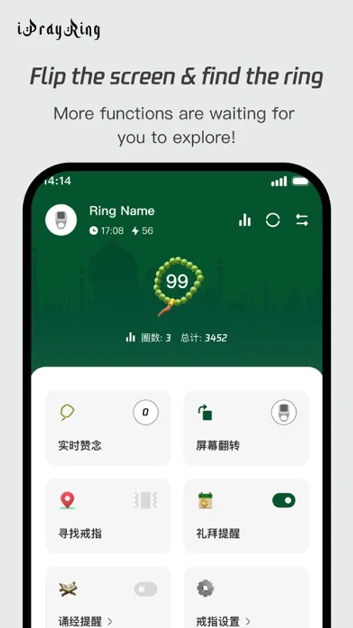 The ring button will replace a string of 33 or 99 Muslim beads, simulate counting through the ring button, and correspond to vibration reminders.