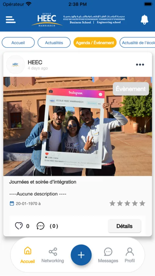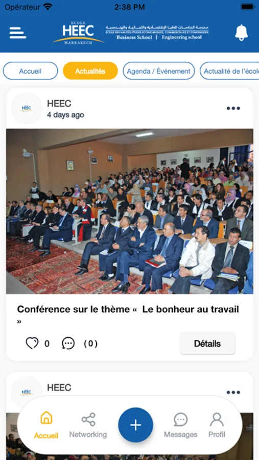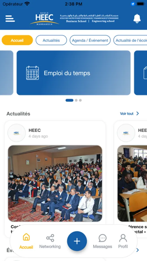 Un module de publication propose des actualités et événements de l’école. Les étudiants peuvent partager des informations (annonces ou autres demandes) à travers un module d’échange entre étudiants.