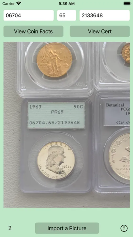 This app is designed to read coin identification numbers using machine vision off of coin slabs. Primarily, this was designed to read rattler slab numbers but it will also read numbers off newer slabs and slabs from both major grading company. Live video text recognition is supported as well as importing an image. If multiple coin identifiers are detected, the user can pan and zoom the image to isolate the picture to one specific slab. No more typing in numbers manually! Once a coin ID and/or serial number are detected, the buttons at the top of the app allow navigating to the proper website (or installed app) to look up the price guide or certification information.