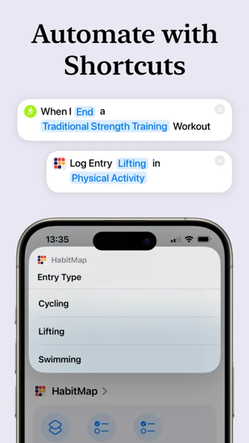 • Shortcuts: Tired of logging your habits manually? Set up shortcuts and automations to make your life easier.