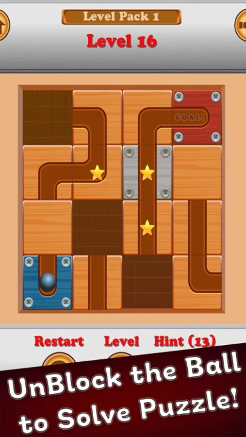 Guide the ball to the goal block by moving the blocks. Some Fixed blocks can't be moved.