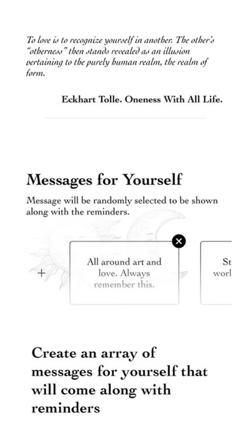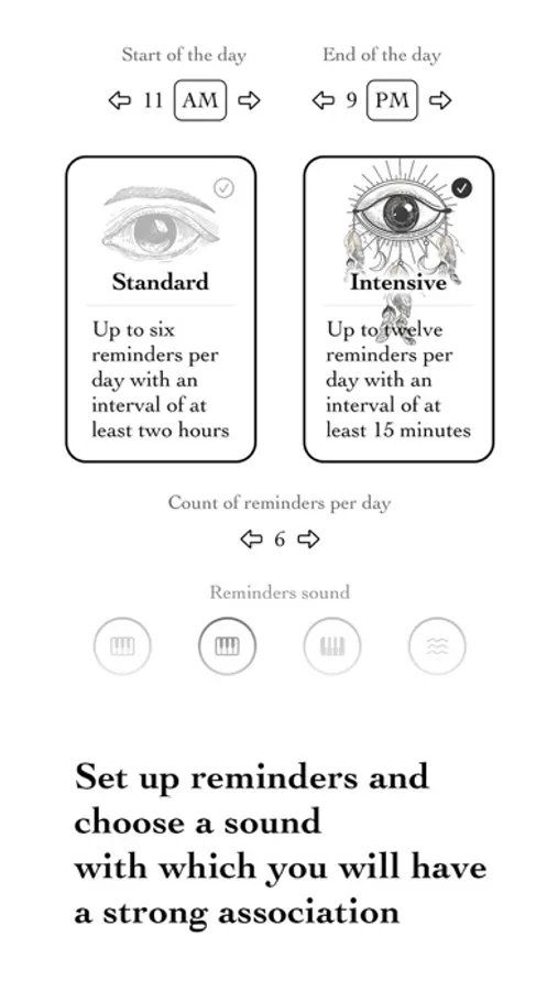 Create an array of messages that you would like to receive from yourself throughout the day. They will come along with reminders to be awareness. Specify what time your day starts and ends, select the number of reminders and the sound with which you will have a strong association.