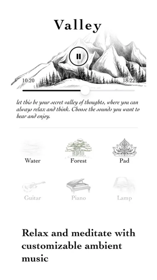 Hello. This app is designed to help you develop Presence. In order to break the chain of cause-dependent stream of thoughts several times a day and make space for awareness.