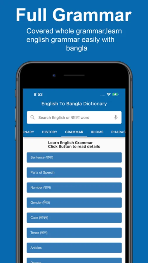 This english to bangla dictionary also includes a full english grammar that described easily.you can learn english grammar easily for this english to bengali dictionary.
