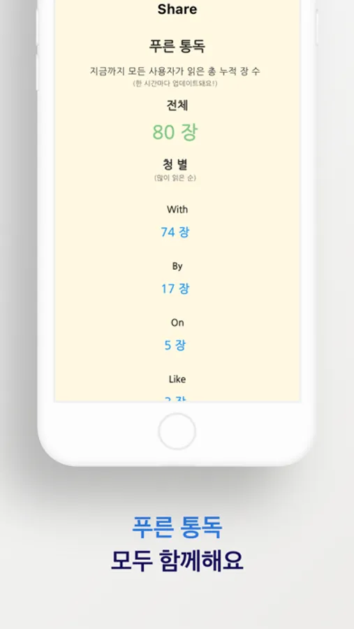 - 한정 기간동안 The Word의 모든 사용자들이 읽은 전체와 각 공동체 별로 푸른 통독의 총 누적 장 수를 합계해서 보여줘요.