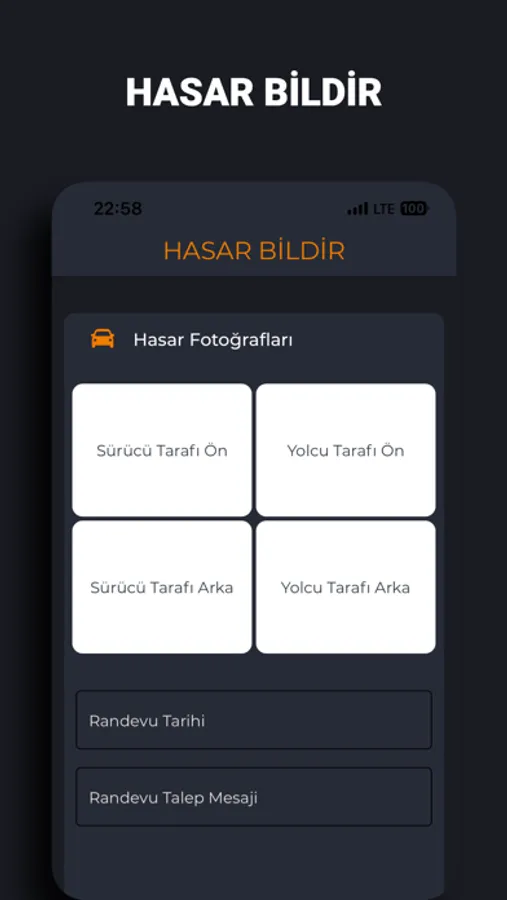 Hasar Bildir: Hasar aldığınızda, sadece birkaç adımda hasar bildirimini yapın. Fotoğraflarla desteklenen bildirimler sayesinde sorununuz hızlıca çözülsün.