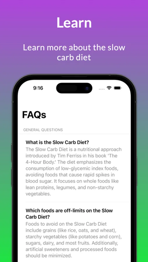- Learn with FAQs: New to the slow carb diet? Our FAQs section offers insights and answers to help you get acquainted with the ins and outs of this healthful diet.