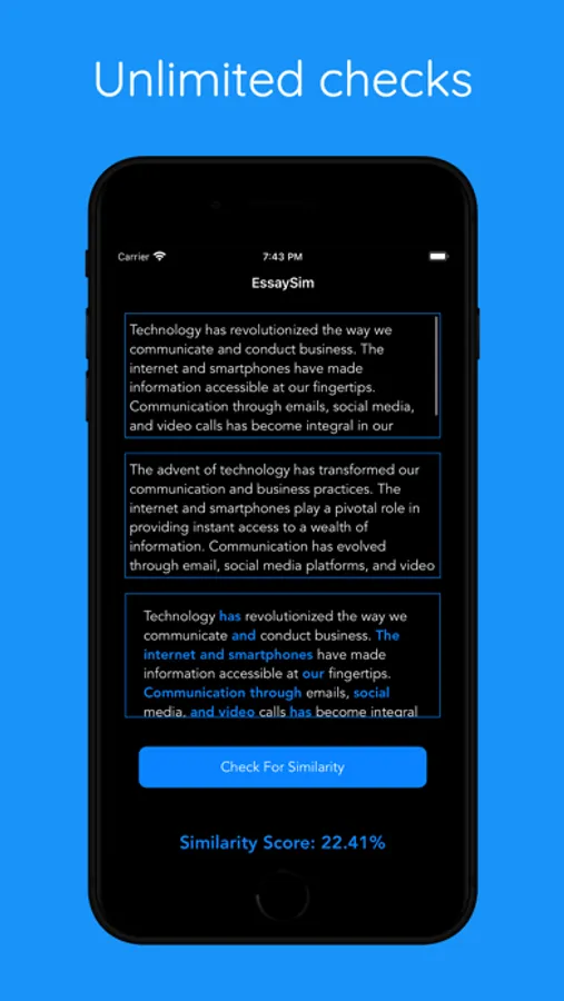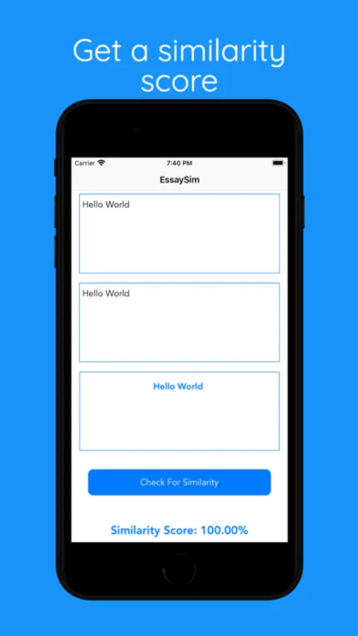 - Detailed Similarity Score: Our app generates a precise similarity score, allowing you to gauge the resemblance between two essays. This score empowers you to fine-tune your work and maintain the authenticity of your writing.