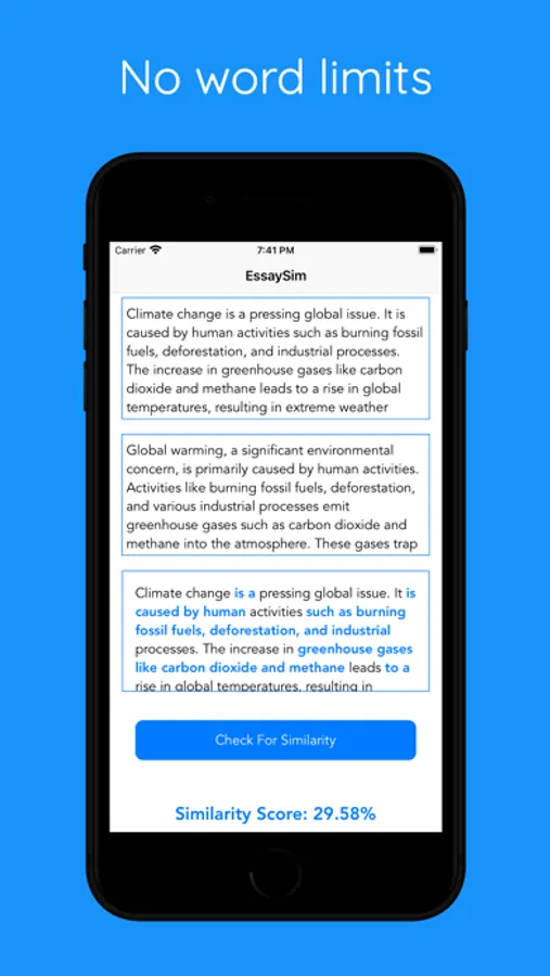 - Customized Similarity Analysis: Say goodbye to word and check limits! EssaySim provides a comprehensive analysis, highlighting similar words in bold, giving you a clear understanding of the overlap and originality in your content, regardless of the length.