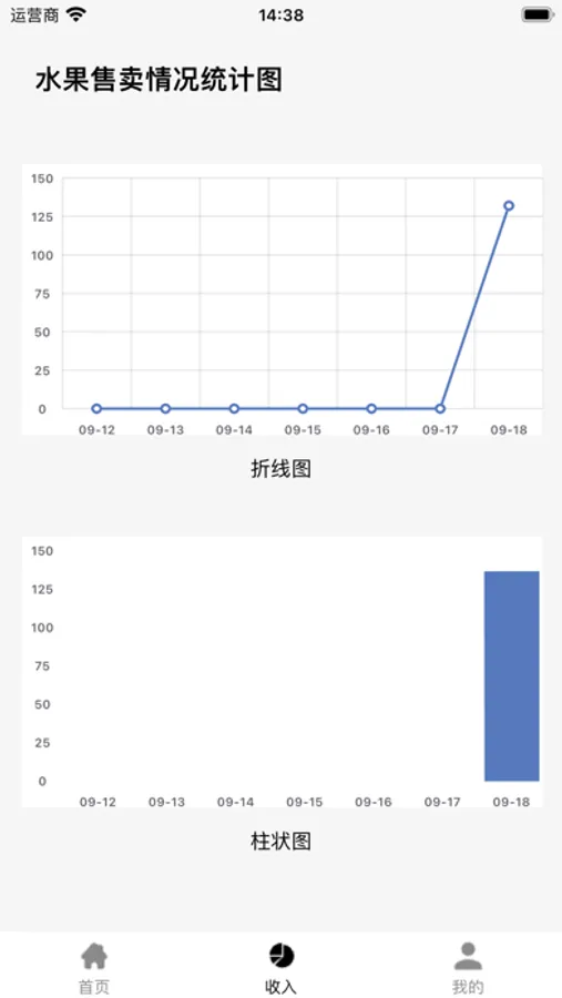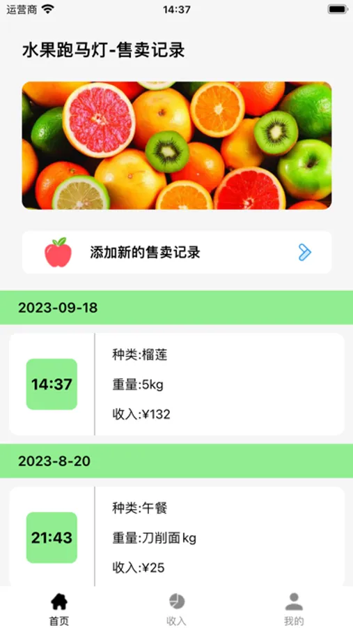 水果跑马灯-售卖记录是一款帮助水果摊贩店主制作的收入情况统计软件,用户可以记录售卖的水果种类、种类和收入金额,数据在「收入」页面按照折线图和柱状图展示。