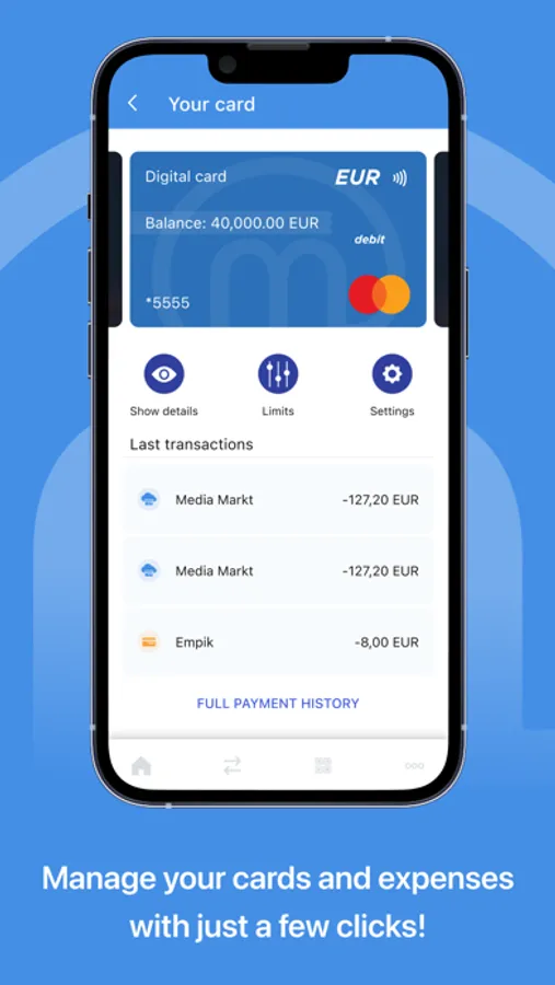 Virtual and physical payment cards that can be freely topped up. Order cards, make payments and top them up when you need to use them.