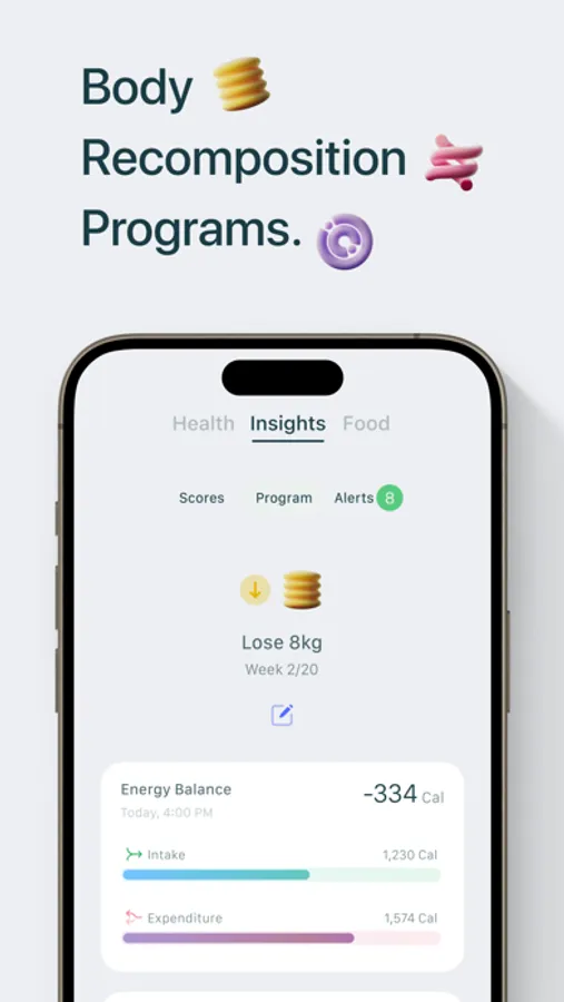 Start a Program to lose weight, gain muscle, or maintain weight, and see all your goals automatically re-configure to meet your Program deadline. Record your daily habits in your Journal to see how they impact your overall well-being. Track your water intake to ensure you are always staying hydrated. Stepping on a scale every morning? Our weight-tracking algorithms analyse your logged entries to give you a more accurate estimate of your current weight.