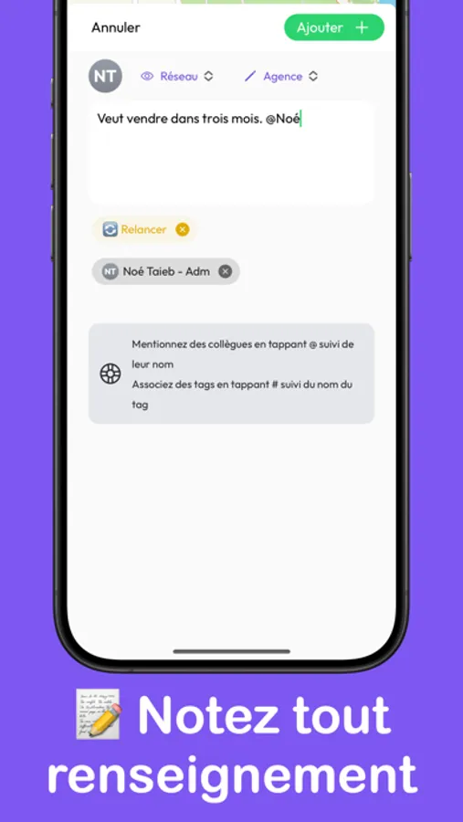 Notes partagées : Collaborez avec vos collègues, recevez des notifications par @mentions et organisez-vous avec des #tags.