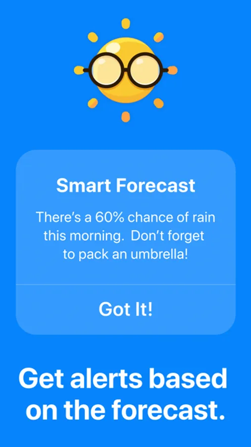 Smart Weather offers a comprehensive set of features to keep you informed and in control. Get detailed hourly and daily forecasts with essential meteorological data. Stay ahead of the weather curve with forecast-based alerts. Whether you're planning a weekend getaway or simply deciding on your outfit for the day, Smart Weather ensures you're always well-prepared. Get reminders, such as grabbing your sunglasses when the sun is shining or carrying an umbrella when rain is imminent. With Smart Weather by your side, you're not just receiving information; you're making weather-related decisions effortlessly and staying prepared. No more unexpected weather mishaps!
