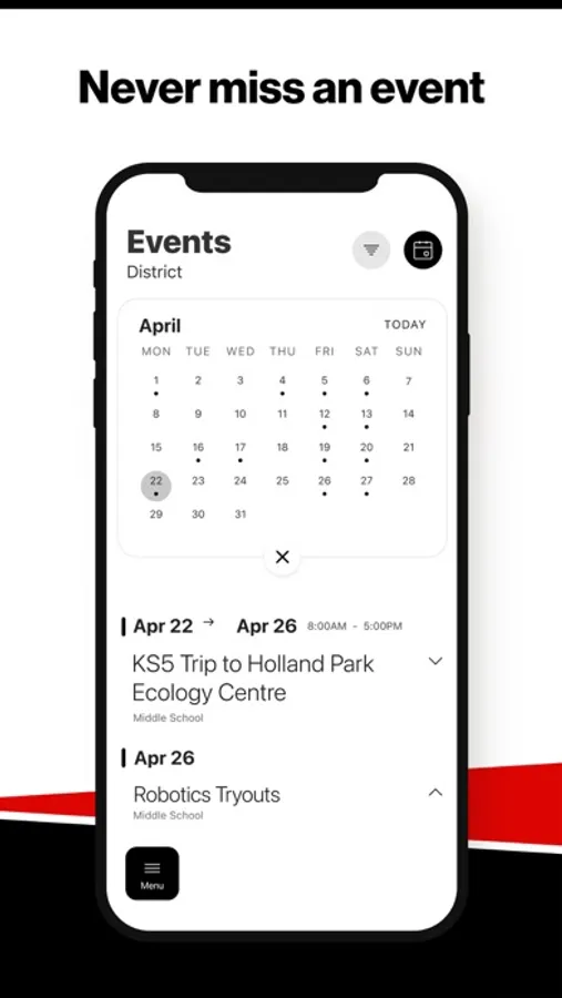 The event section shows a list of events throughout the district. Users can add an event to their calendar to share the event with friends and family with one tap.