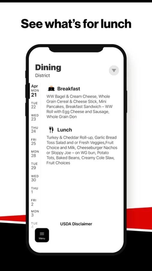 Within the dining section, you'll find an easy to navigate, weekly menu, sorted by day and meal type.