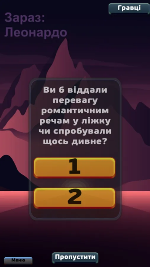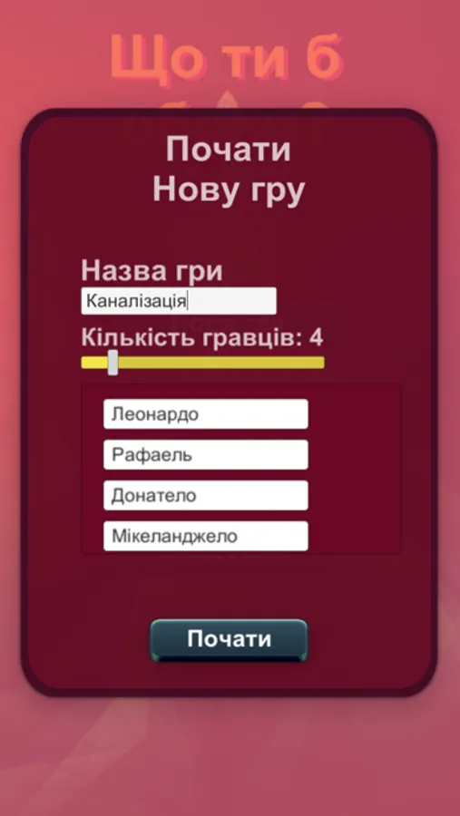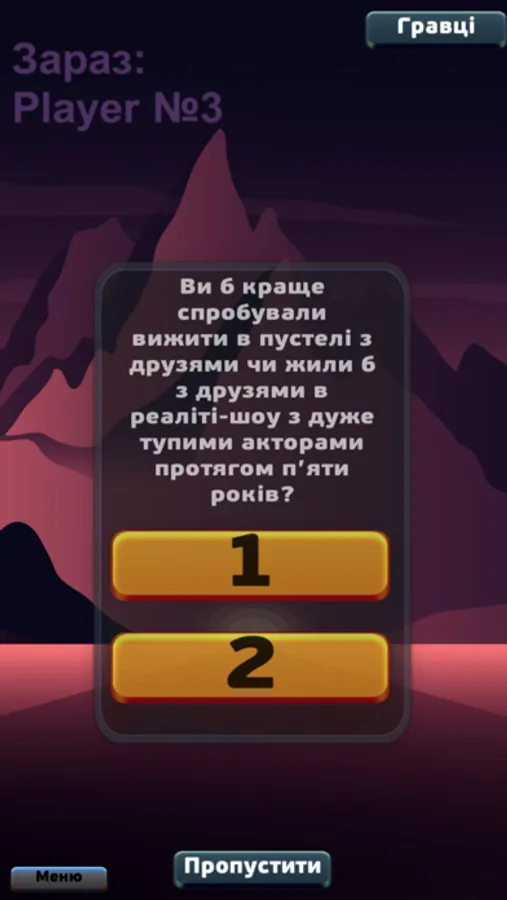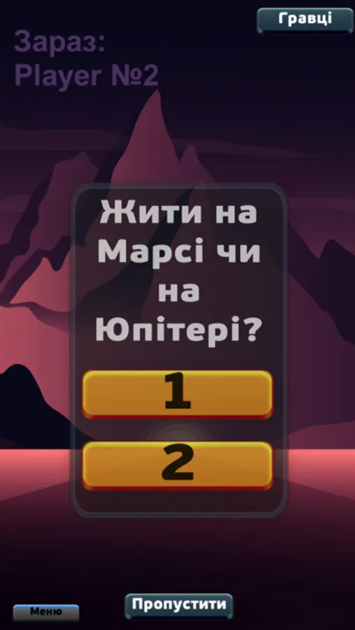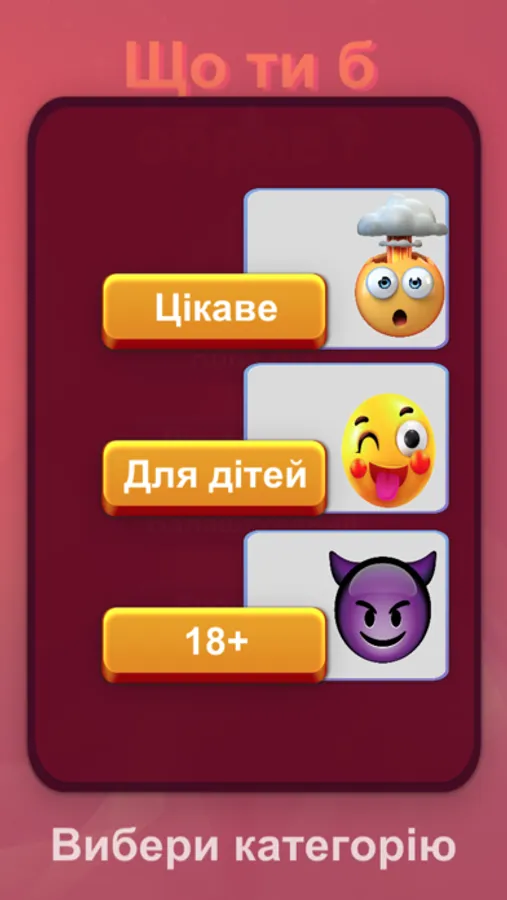 Відповідай на важкі питання у компаніії друзів. Різні категорії для різних вікових груп та для різного настрою. Вибери будь яку категорію з наступних: цікаве, для дітей, 18+ та весело проведи час у компанії друзів. Гра підійде для будь-якої зустрічі, посиденьок чи святкування. Також ти можеш зберегти гру та продовжити її у будь-який час!