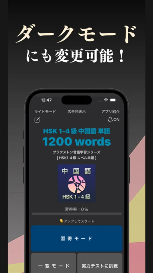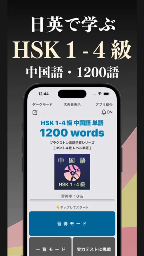 * HSK(中国語検定)の1級、2級、3級、4級レベルの1200語を難易度順に収録しています。