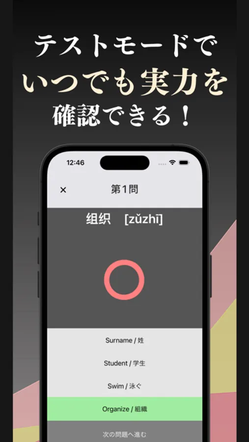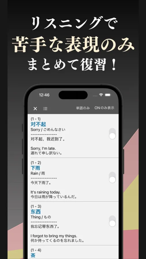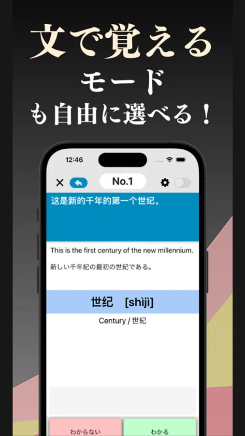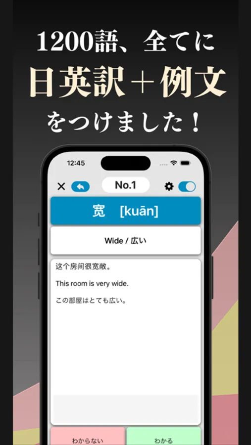 * 中国語には日本語と英語の両方に共通点が多く存在します。例えば漢字を使っている点では日本語に似ていますし、文法はかなり英語に似ています。そこで本アプリでは日・英の両方の訳をつけることで両者の比較を容易にしました。言語は共通点を有効活用することでスムーズに学習できます。(ピン音付き)