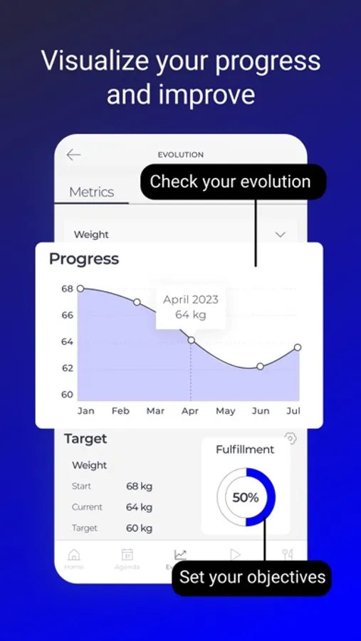 *Control del Progreso:* ¡Celebremos tus victorias! Registra y rastrea tus avances con herramientas visuales que te muestran cómo estás avanzando hacia tus metas. Fotos de antes y después, seguimiento de medidas y más, todo en un solo lugar.