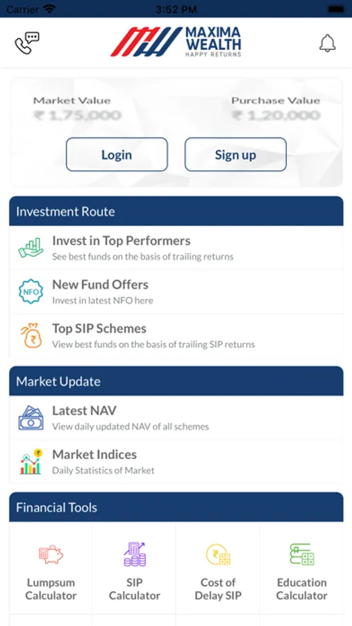 Maxima Wealth: Mutual Funds is one-stop shopping for all your Financial needs. You can use this state of the art app to stay on top of your Complete Financial Portfolio with all assets: